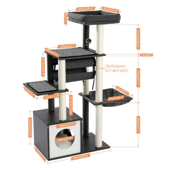 Haben Sie genug davon, dass Ihre Katze ständig Ihr Sofa besetzt und Ihren Wohnraum in einen echten Spielplatz verwandelt? Suchen Sie nicht weiter! Schenken Sie ihr diesen gigantischen Kratzbaum, der nicht nur Ihr Wohnzimmer schön dekoriert, sondern auch das bevorzugte Reich Ihrer Katze wird. Stellen Sie sich vor, wie sie fröhlich klettert und spielt, während sie die Schönheit Ihrer Möbel dank dieses perfekten Kratzbaums bewahrt. Jeden Tag wird Ihr Lieblingsprodukt ein wahres Vergnügen für Ihren geliebten Begleiter sein und ihm alle notwendigen Elemente für einen erholsamen Schlaf nach seinen unermüdlichen Abenteuern bieten!