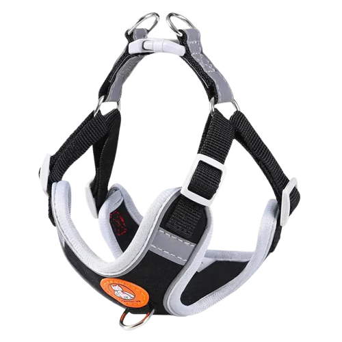 Wenn die Nacht hereinbricht, müssen Sie sich keine Sorgen um die Sichtbarkeit Ihres wertvollen Begleiters machen; die superhellen reflektierenden Streifen sorgen für sicheres Gehen bei Tag und Nacht. Praktisch ist das Geschirr mit einer doppelten Zugverbindung ausgestattet: eine in O-Form aus Aluminiumlegierung auf dem Rücken und die andere in D-Form auf Brusthöhe, die eine optimale Befestigung für die Leine bietet.