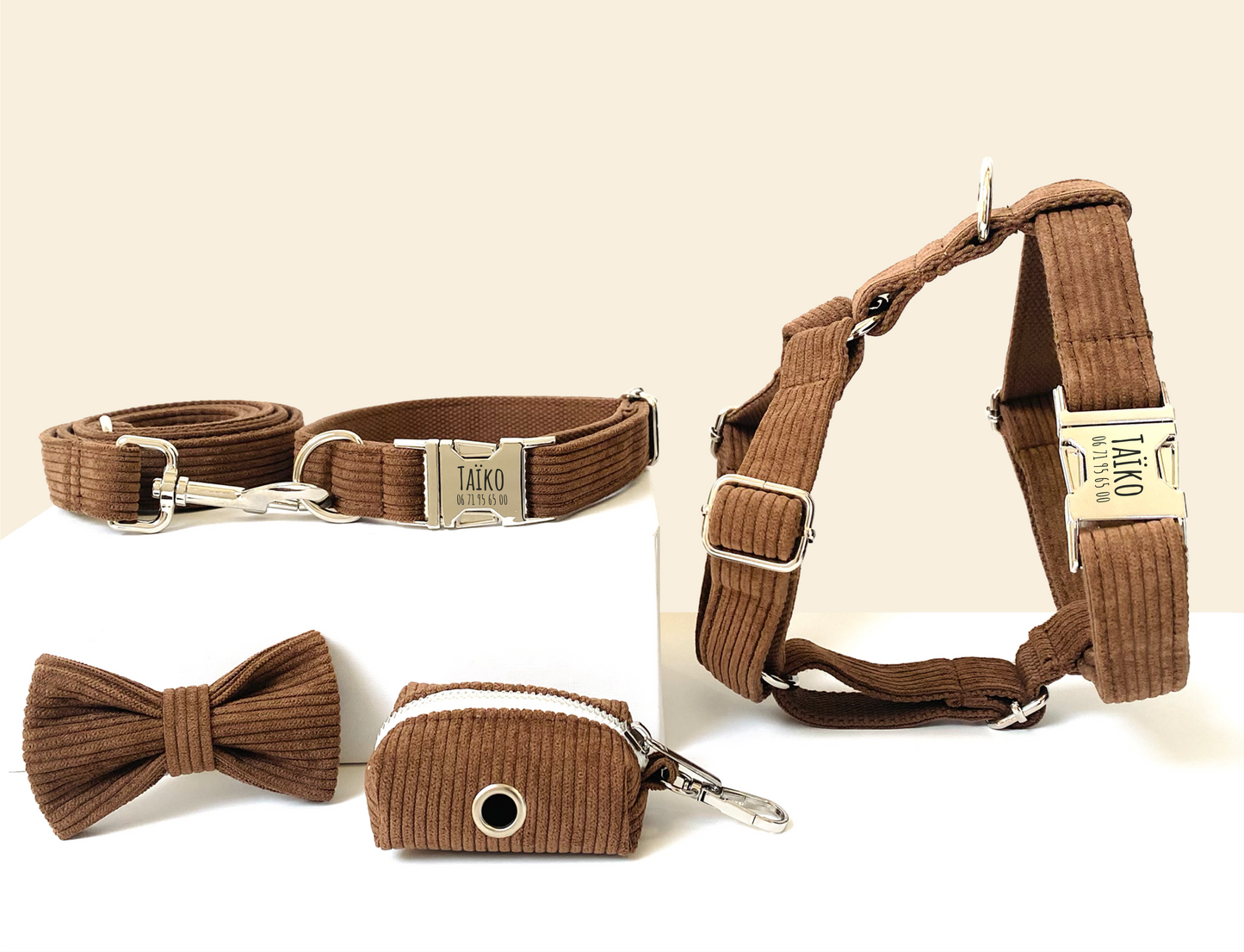 Mit einem Halsband, einem Geschirr, einer Leine, einer superweichen Fliege und sogar einer Tasche für die Kotbeutel sind Sie bestens ausgestattet! Stellen Sie sich die bewundernden Blicke vor, die Sie bei Ihren Spaziergängen erhalten werden. Die Freundlichkeit einer Fliege verleiht einen verspielten Touch, während das Geschirr für sicheren Halt Ihres Begleiters sorgt, selbst bei seinen wildesten Abenteuern. Vergessen Sie mittelmäßige Produkte, Eleganz und Stil sind mit unserem kompletten personalisierten Hundezubehör garantiert.